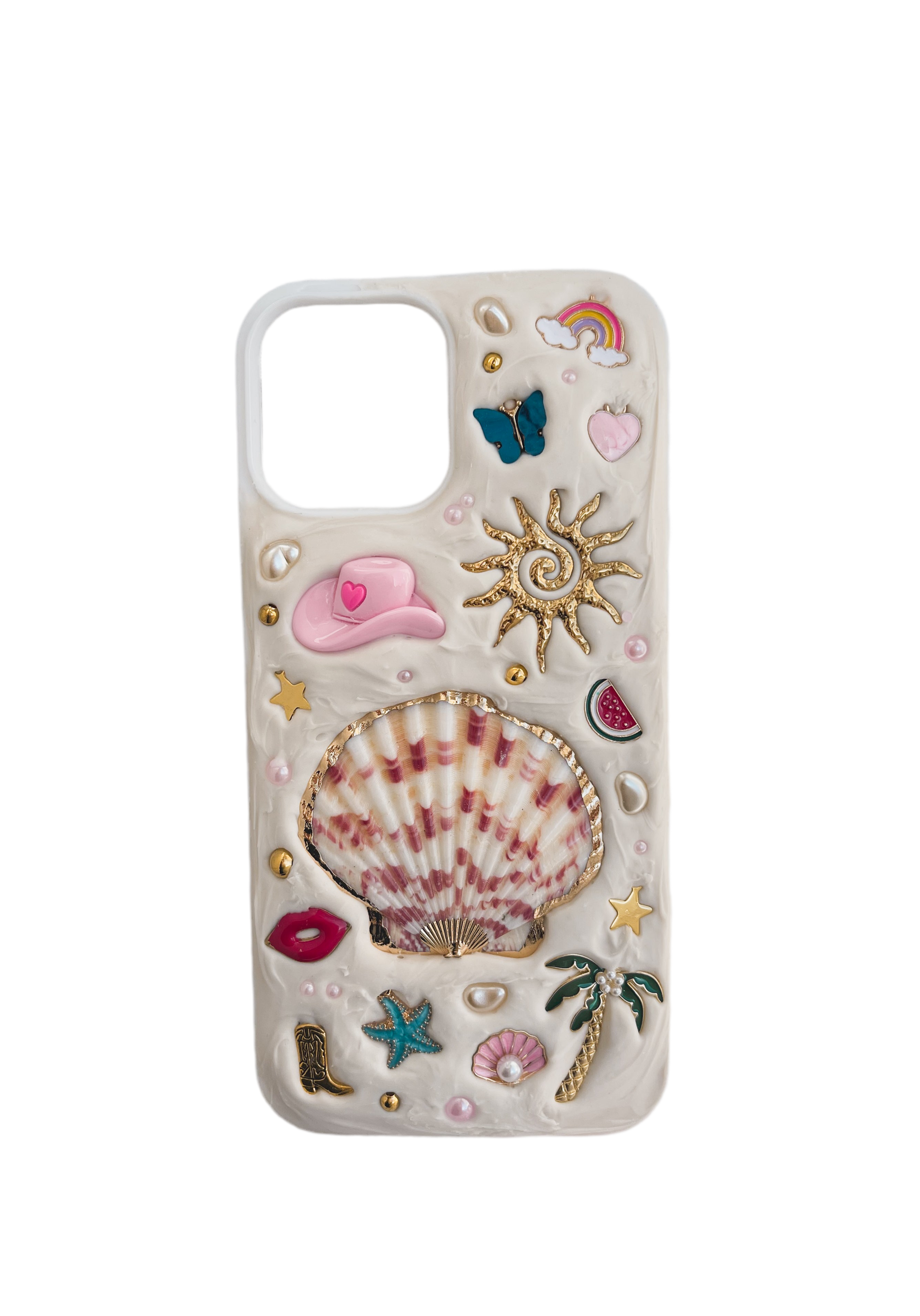 À noter : chaque modèle de téléphone a une taille différente, et chaque coquillage que nous utilisons est unique — les décorations peuvent donc légèrement varier en couleur, forme ou emplacement.