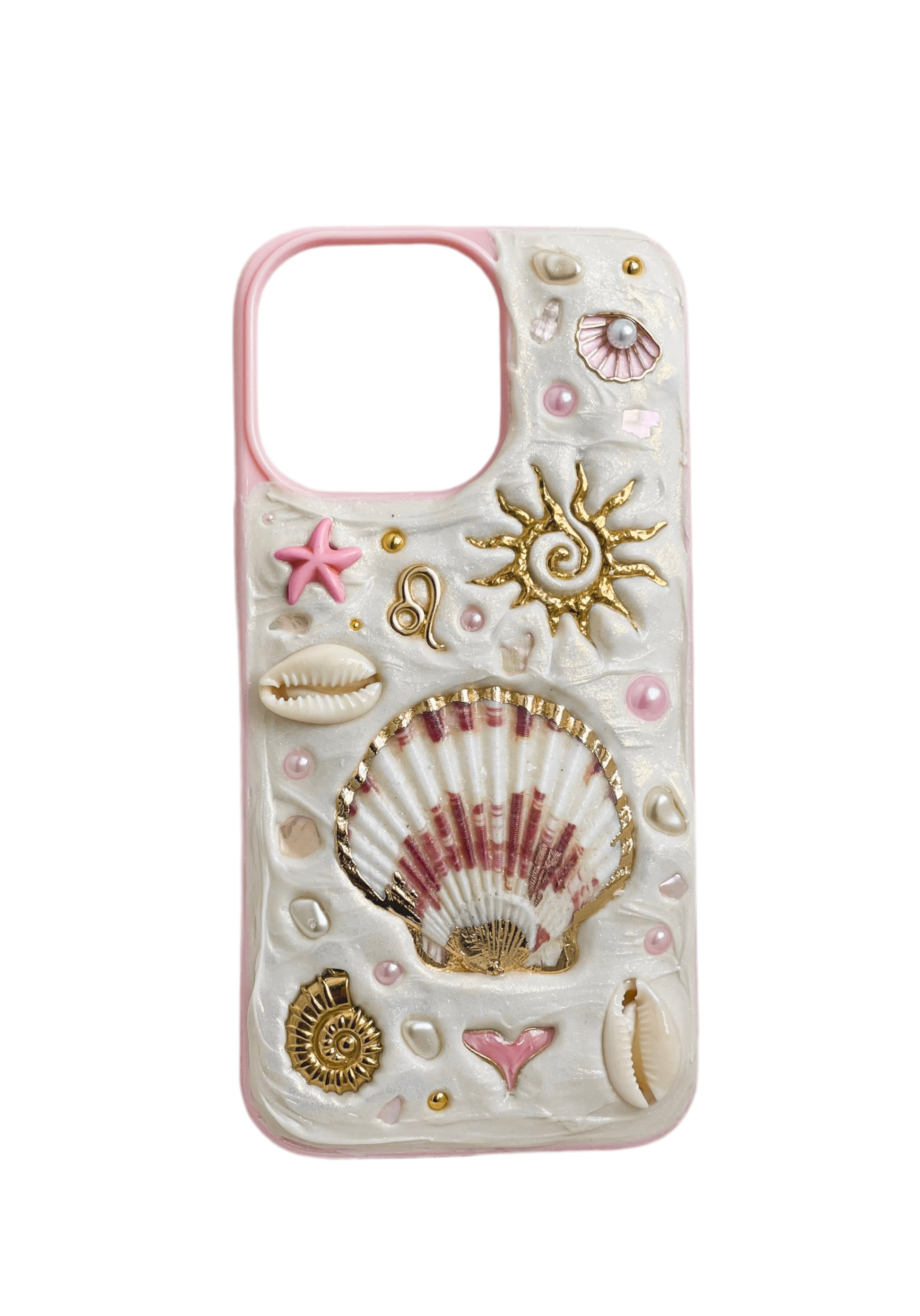 À noter : chaque modèle de téléphone a une taille différente, et chaque coquillage que nous utilisons est unique — les décorations peuvent donc légèrement varier en couleur, forme ou emplacement.