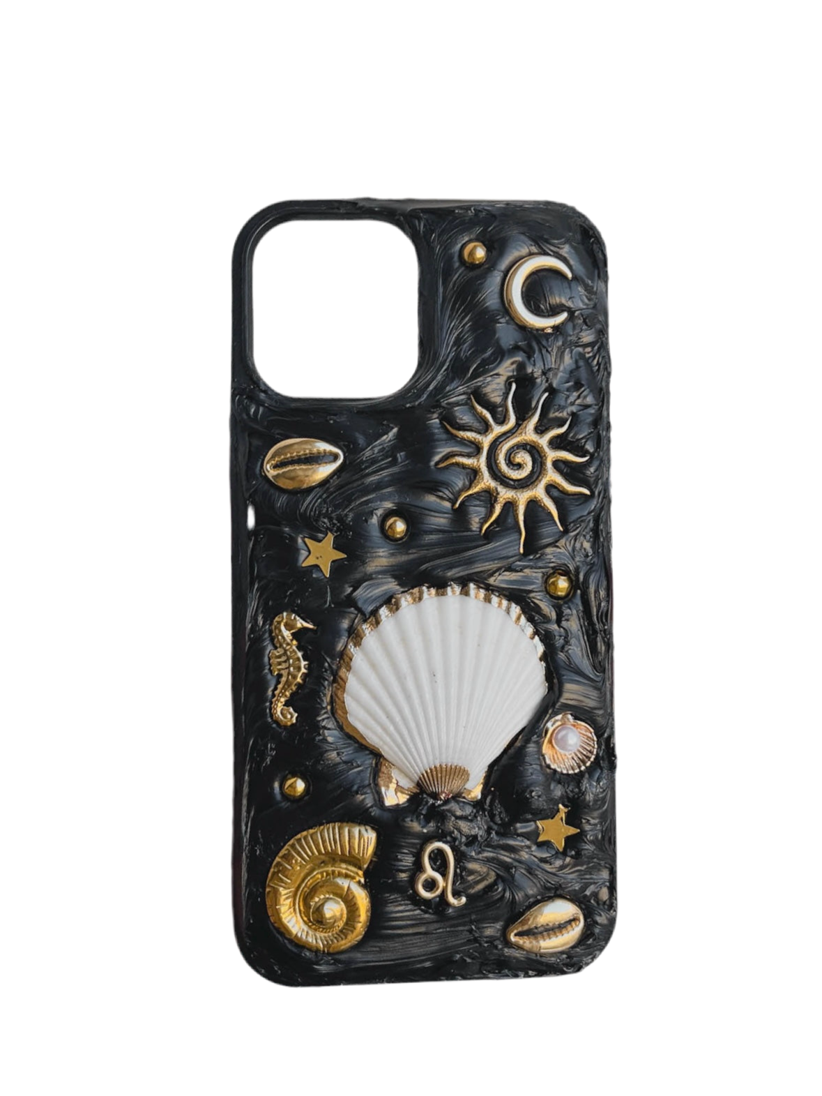 Une coque noire ornée de coquillages et de détails dorés, pensée pour celles et ceux qui aiment les teintes sombres, recherchent une touche sophistiquée ou simplement adorent le noir… sans jamais renoncer à briller. Chaque pièce, faite à la main, capture l’équilibre parfait entre mystère et lumière, entre élégance et éclat estival.