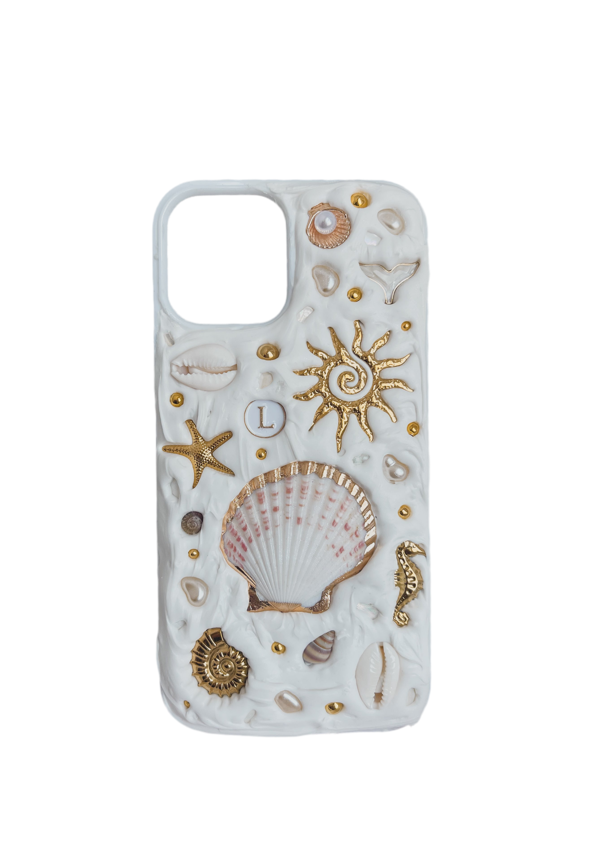 À noter : chaque modèle de téléphone a une taille différente, et chaque coquillage que nous utilisons est unique — les décorations peuvent donc légèrement varier en couleur, forme ou emplacement.